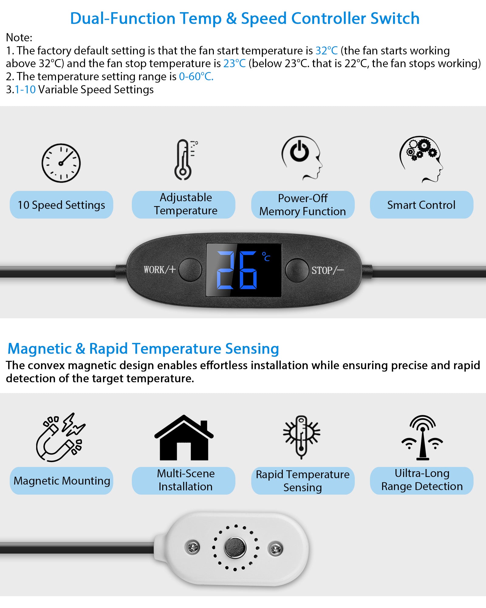 · Intelligente Programmierung: Mit der integrierten Temperaturregelung können Sie den Betrieb des Lüfters nach Bedarf anpassen, um ein effizientes Energiemanagement zu gewährleisten.