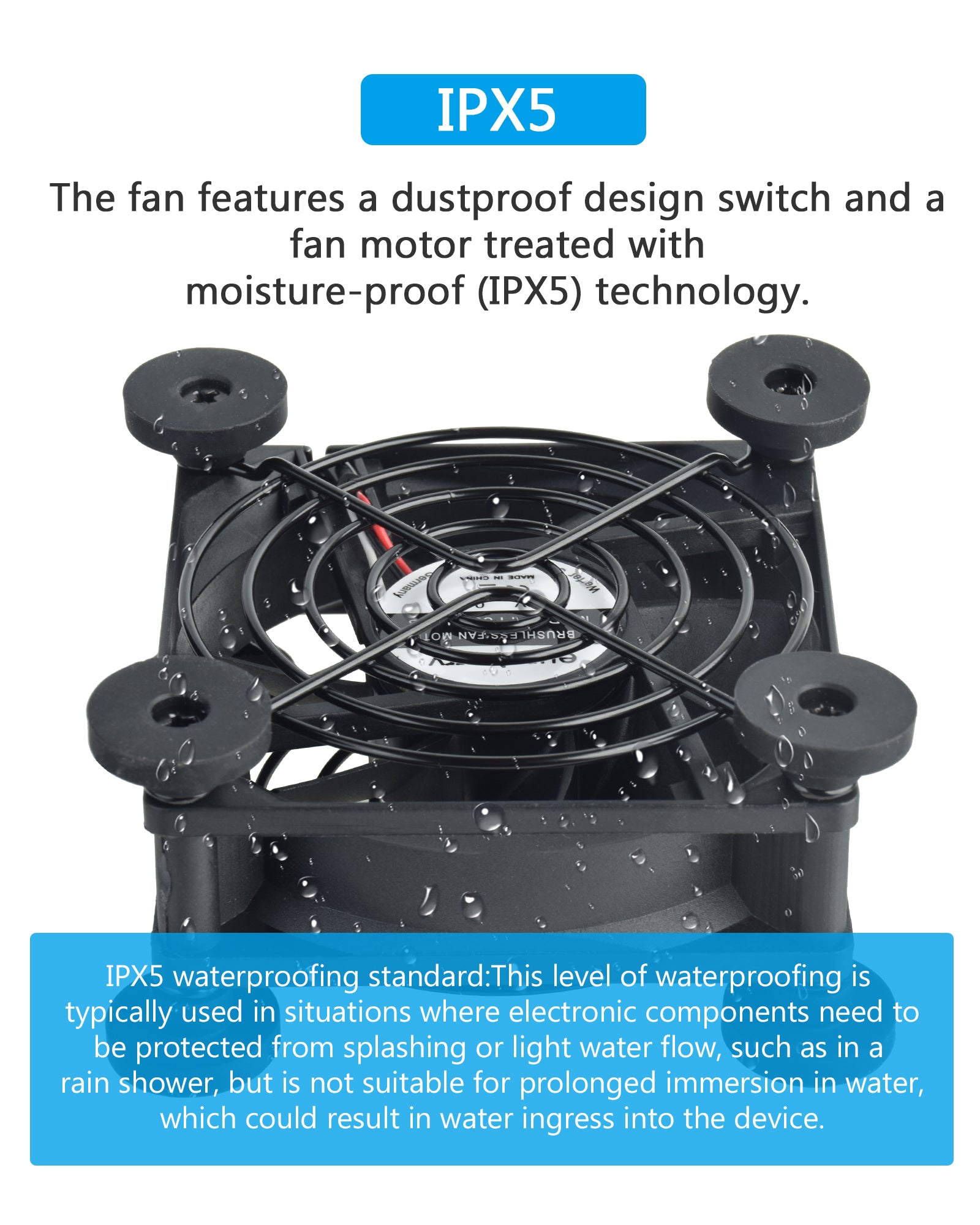High-End-Qualität: Der Ventilator nimmt staubdichten Designschalter an, und der Lüftermotor wird mit feuchtigkeitsbeständiger (IPX5) Technologie behandelt. Dadurch wird sichergestellt, dass der Ventilator eine Vielzahl komplexer Umgebungen bewältigen kann und eine zuverlässige und effiziente Kühlung bietet. Dieser Lüfter ist mit zwei Kugellagern ausgestattet und hat eine lange Lebensdauer von 60.000 Stunden, wodurch ein stabiler Betrieb für eine lange Zeit gewährleistet wird.