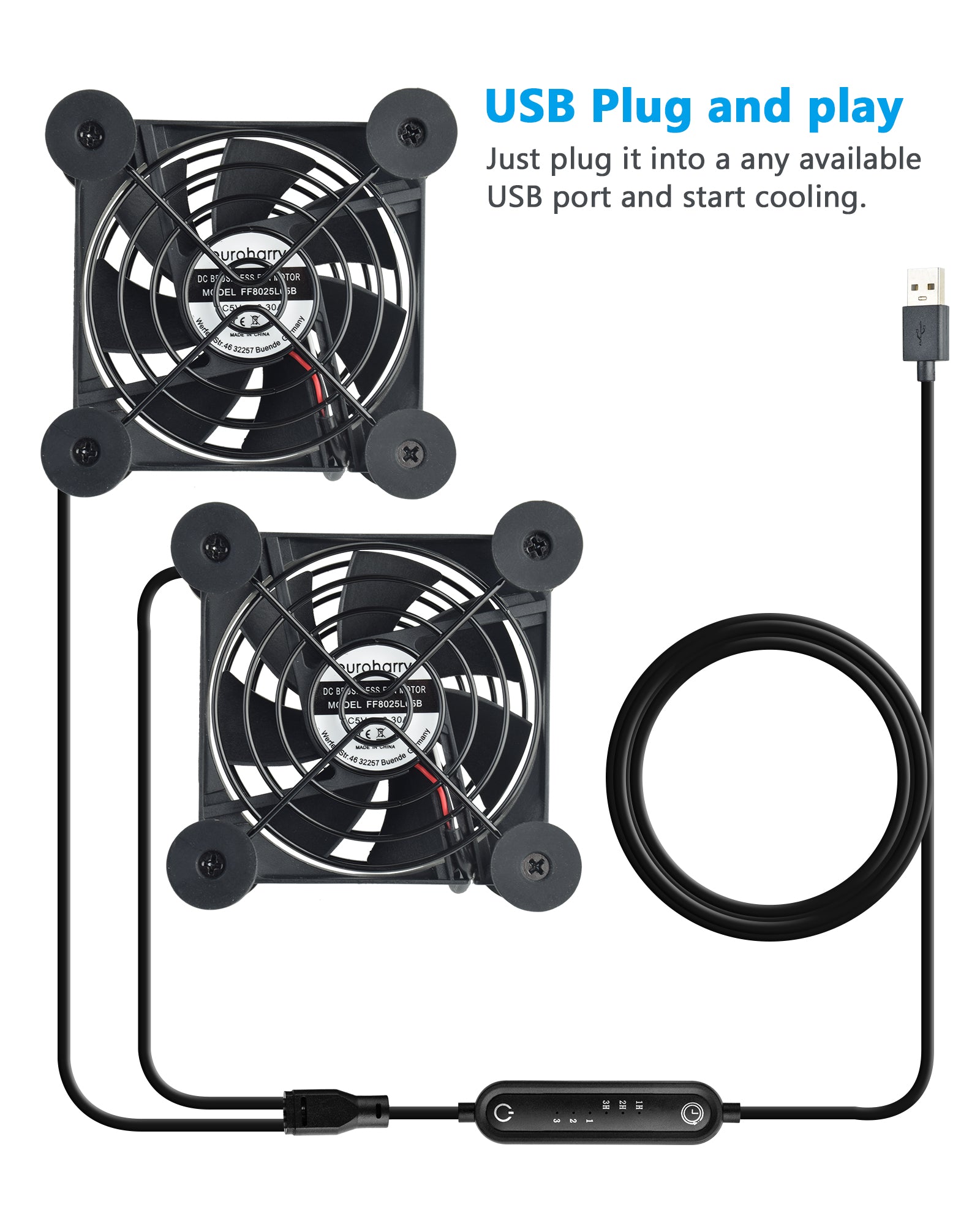 Euroharry USB 80mm Silent Fan 2-in-1, 6 Windgeschwindigkeiten und Smart Timing Controller, Motor Moisture Resistant (IPX5) Staubdicht, Breitspannungs-kompatibel 5-12V Geeignet für elektronische Geräte, Haustiernester, Pflanzenhäuser